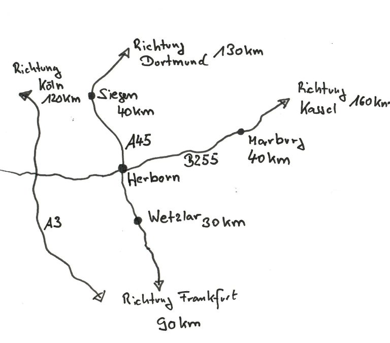 Die Homebase der Arbeit liegt in Herborn, eingebettet in die reizvolle Mittelgebirgslandschaft zwischen Westerwald, Lahn-Dill-Bergland und Rothaargebirge. Die Umgebung verbindet naturnahe Ruhe mit einer gewachsenen Infrastruktur und hoher Lebensqualität. Gleichzeitig überzeugt dieser Ausgangspunkt durch eine sehr zentrale Lage: Die direkte Anbindung an die Autobahn A45 („Sauerlandlinie“) ermöglicht eine schnelle Erreichbarkeit der Ballungsräume Rhein-Main, Rhein-Ruhr und Mittelhessen. Auch überregionale Projektstandorte sind effizient erreichbar – ein klarer Vorteil für flexible, bundesweite Einsätze.